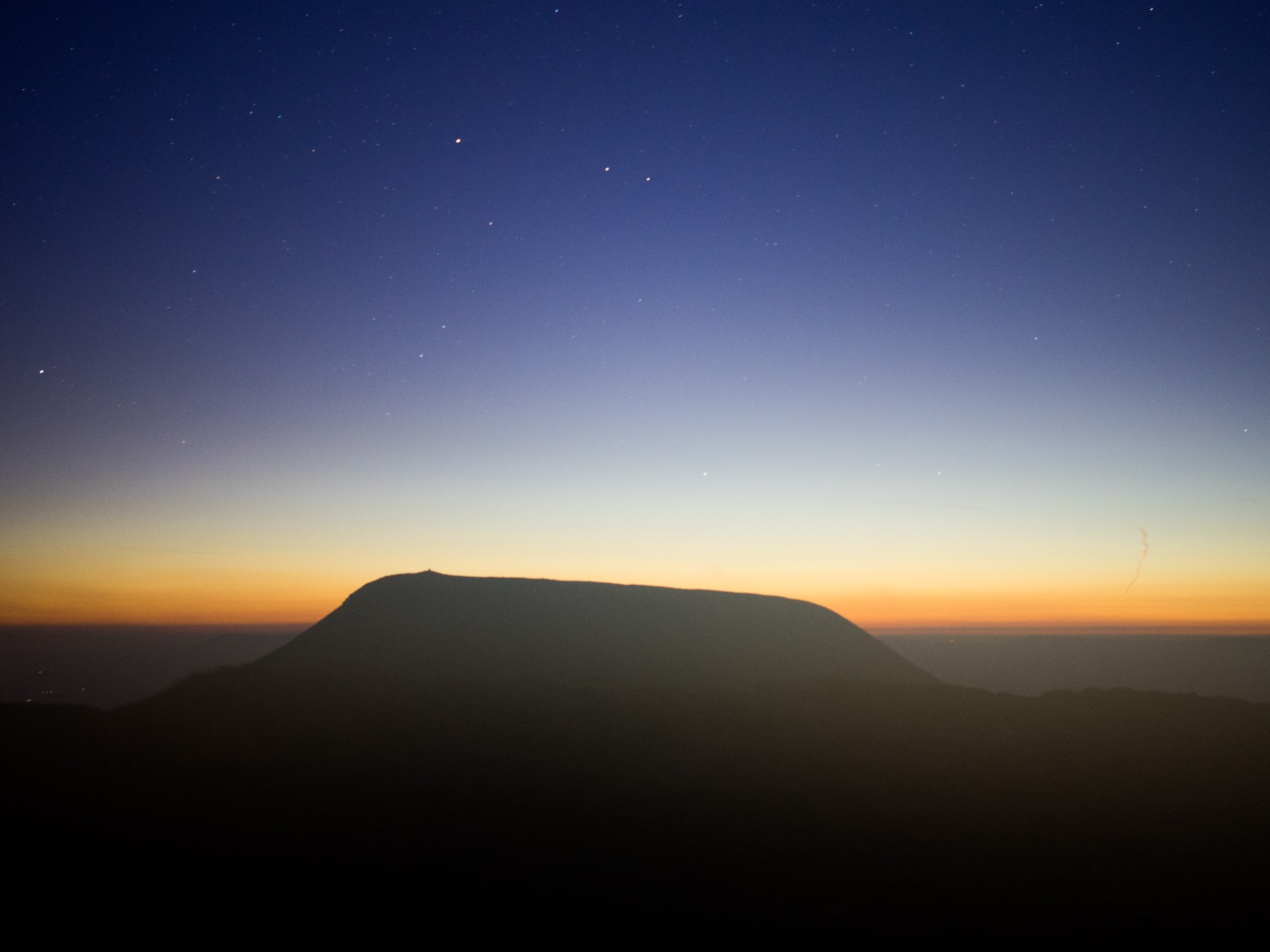 The last stretch to the finish doesn’t look like much. It’s only 16 km as the crow flies but it includes three summits (one of which is the highest point in the race) and is largely tackled in darkness. With the sun starting to go down, I took the opportunity to put on my headtorch and a warm top before joining up with Nick again for the final push. We opted to take the slightly longer but less steep route up to Pen y Fan (500m+). Once we were about three quarters of the way up, a dense mist set in and despite having done this climb more than twenty times, I took the wrong path over the top of Corn Du rather than around it. From the top of Corn Du, we got into a bit of a pickle trying to work out the correct bearing towards Pen y Fan which was only a few hundred metres away. With a steep escarpment nearby and the temperature dropping rapidly, it was a bad idea to stop moving but an even worse one to take a wrong turn, get lost and tumble off a cliff so we took a few minutes and eventually worked it out.